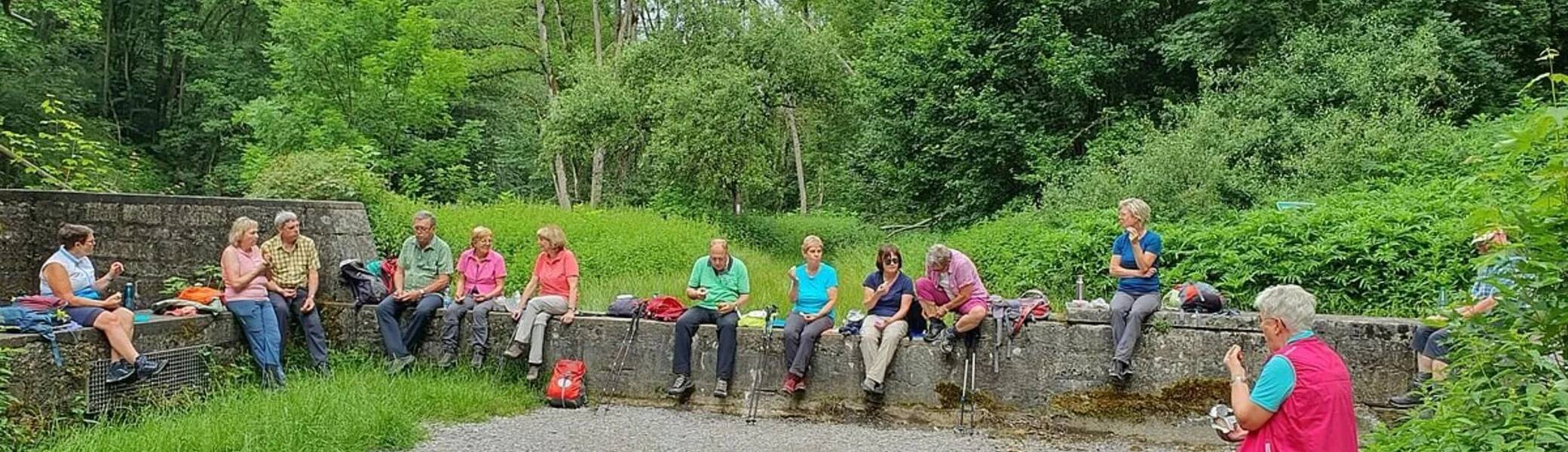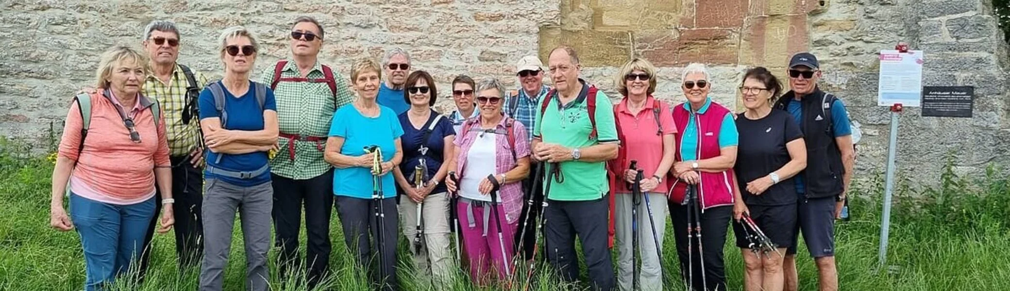 Von weitem sahen wir die Anhäuser Mauer. Vor der eindrucksvollen Mauer machten wir einen Stopp, damit Wendelin uns Informationen geben konnte. Sie ist 20m hoch und 10 Meter lang, der Rest des Klosters Anhausen. Danach überquerten wir die Kreisstraße und wanderten im Wald den Jakobsweg nach Bölgental.