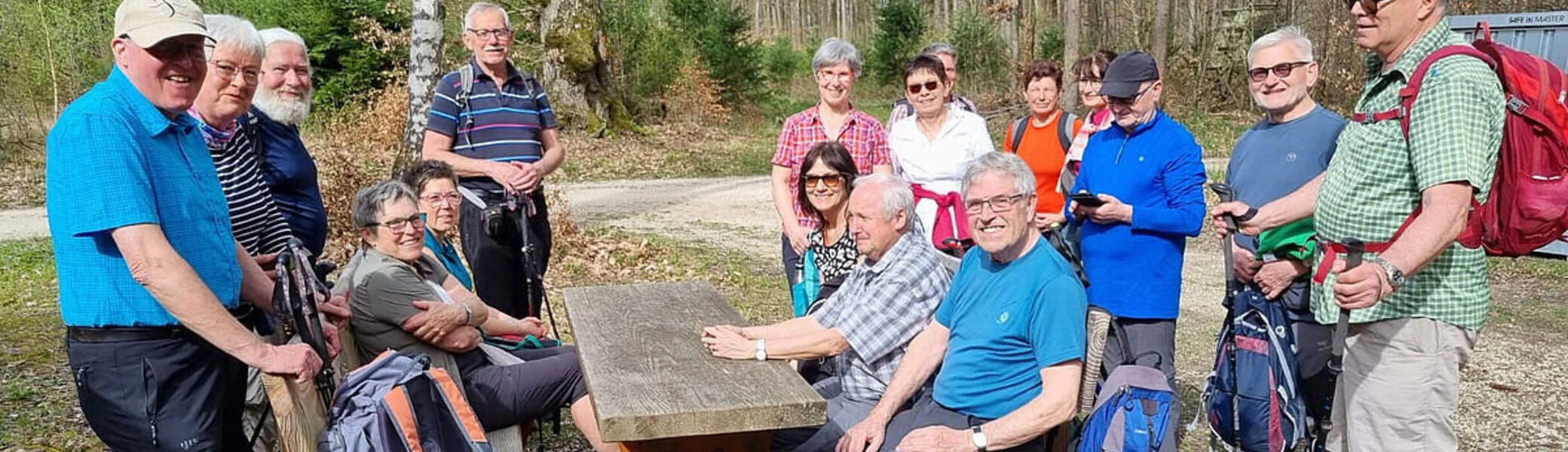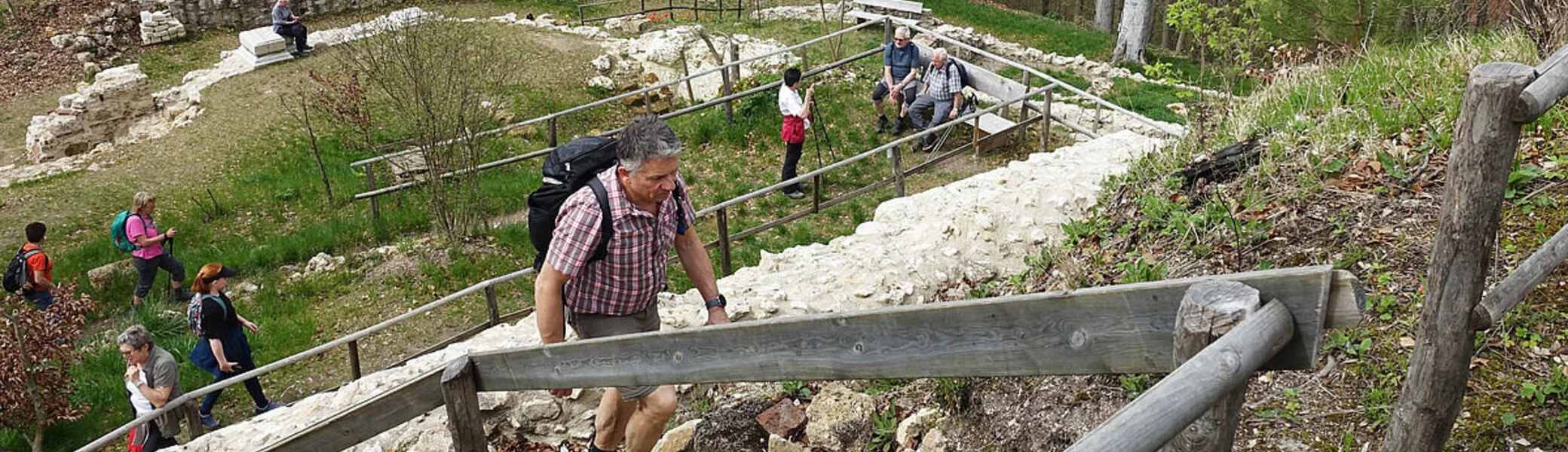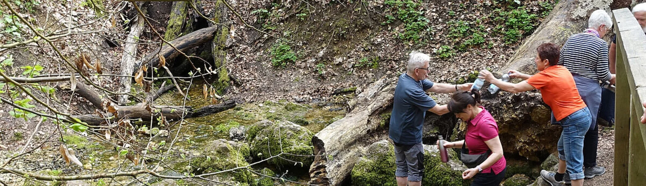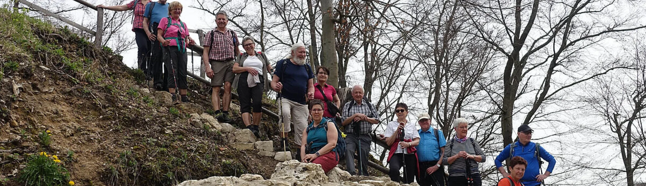Von Unterkochen aus wanderten wir auf dem HW4 Richtung Süd, steil hoch ca. 200 Hm, vorbei am Pfaffenstein, meist durch lichte Buchenwälder. Für April war es ungewöhnlich warm obwohl der Saharastaub die Sonneneinstrahlung dämpfte. Auf der Höhe bogen wir nach Osten Richtung Ebnat ab. Nach einer Vesperpause bei der Wallfahrtskapelle Maria Eich führte der Weg an Ebnat vorbei nach Hohenberg. Über das Tunnel der ehemaligen Härtsfeldbahn stiegen wir auf das Schlossbaufeld, einem Bergsporn zwischen den Quellklingen vom Weißen Kocher und Häselbach. Am Ende des Sporns stand früher die Kocherburg. Nach Besichtigung der Ruine folgte eine Genußwanderung entlang dem Weißen Kocher bis zur Quelle.