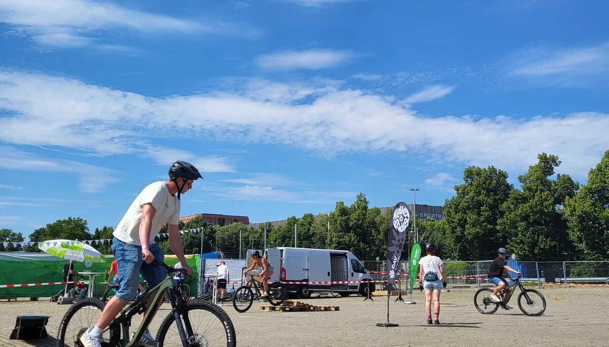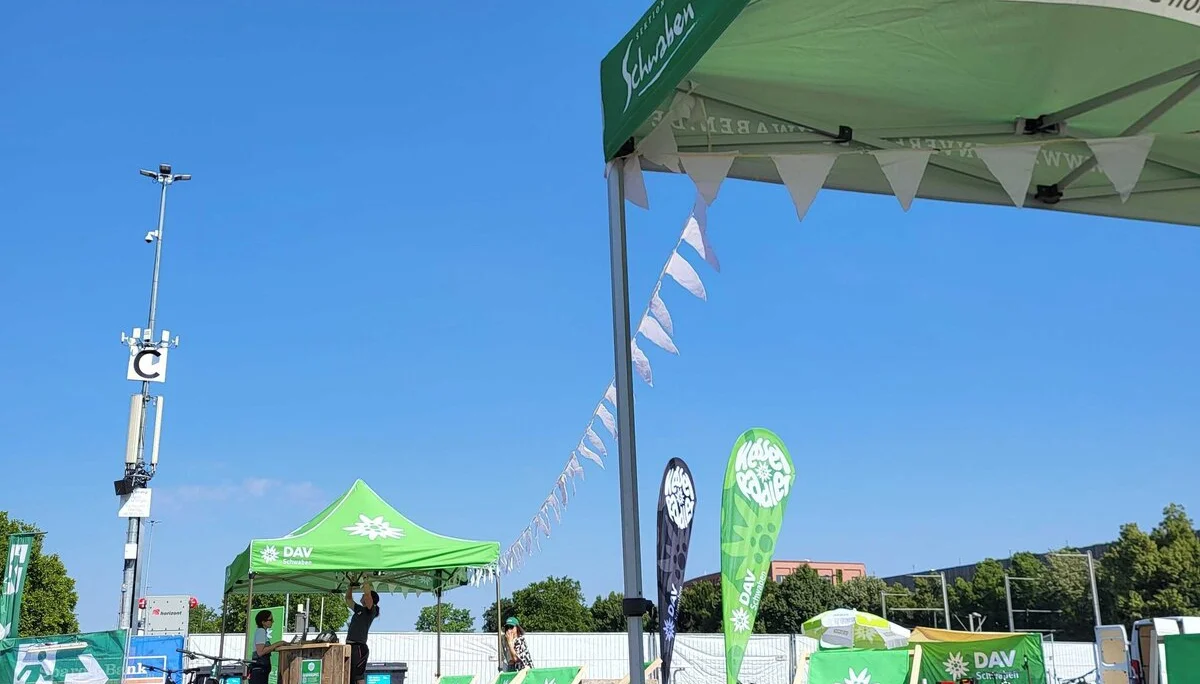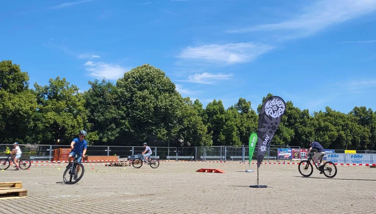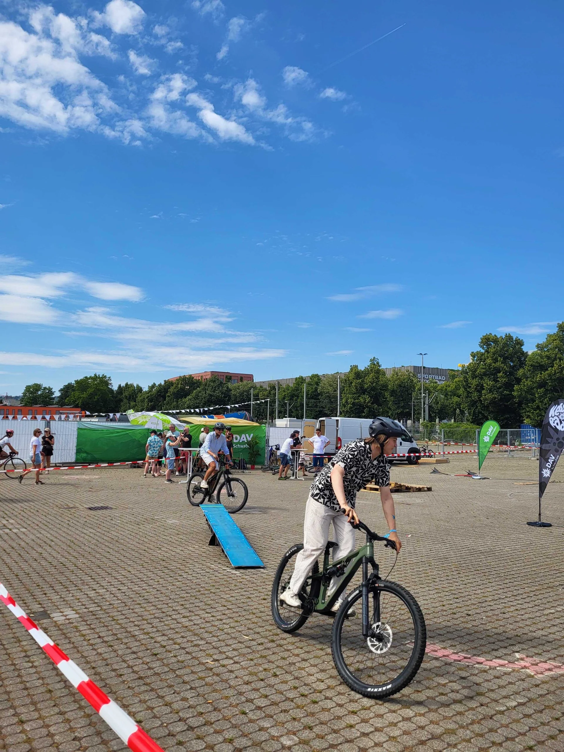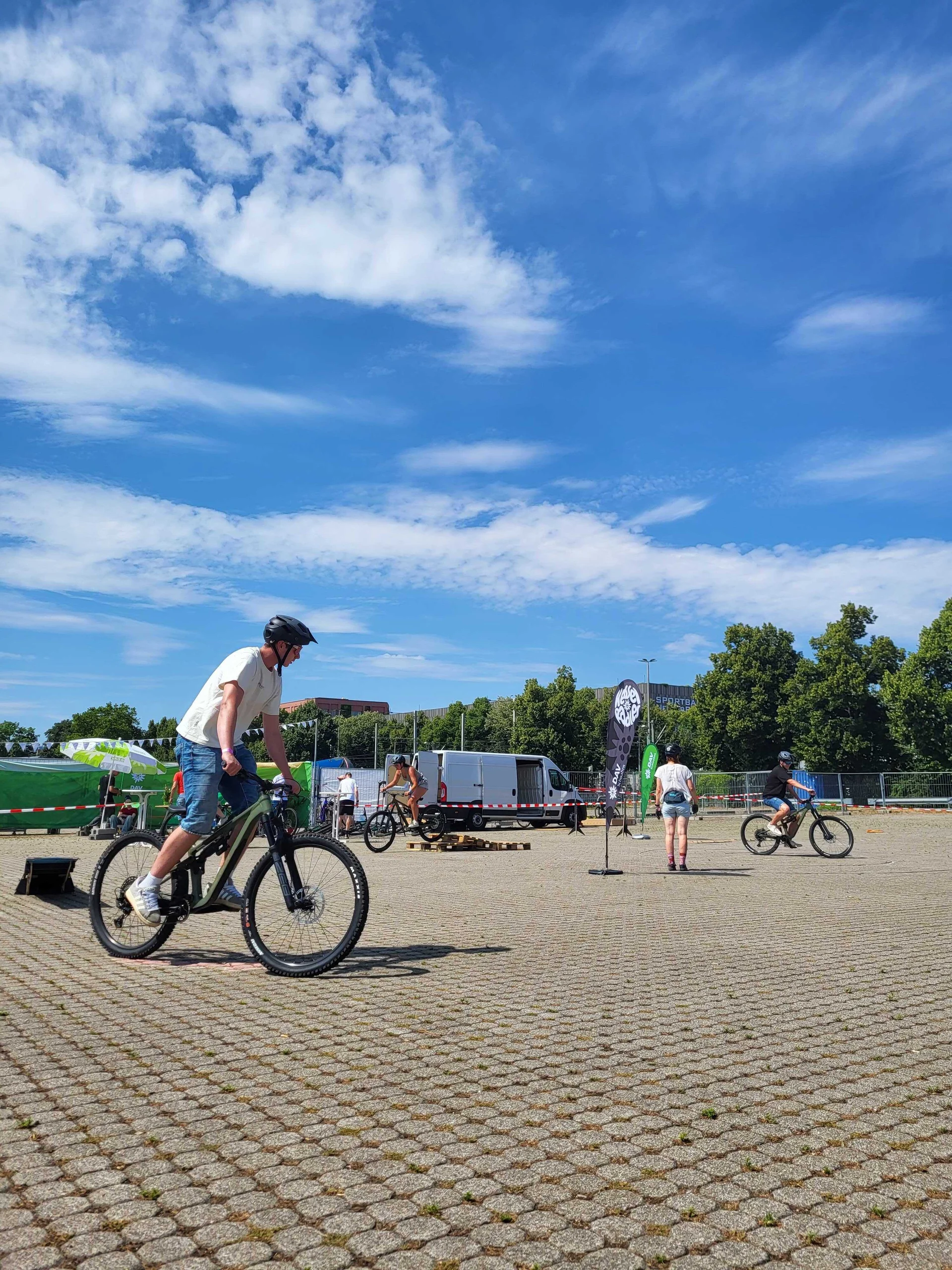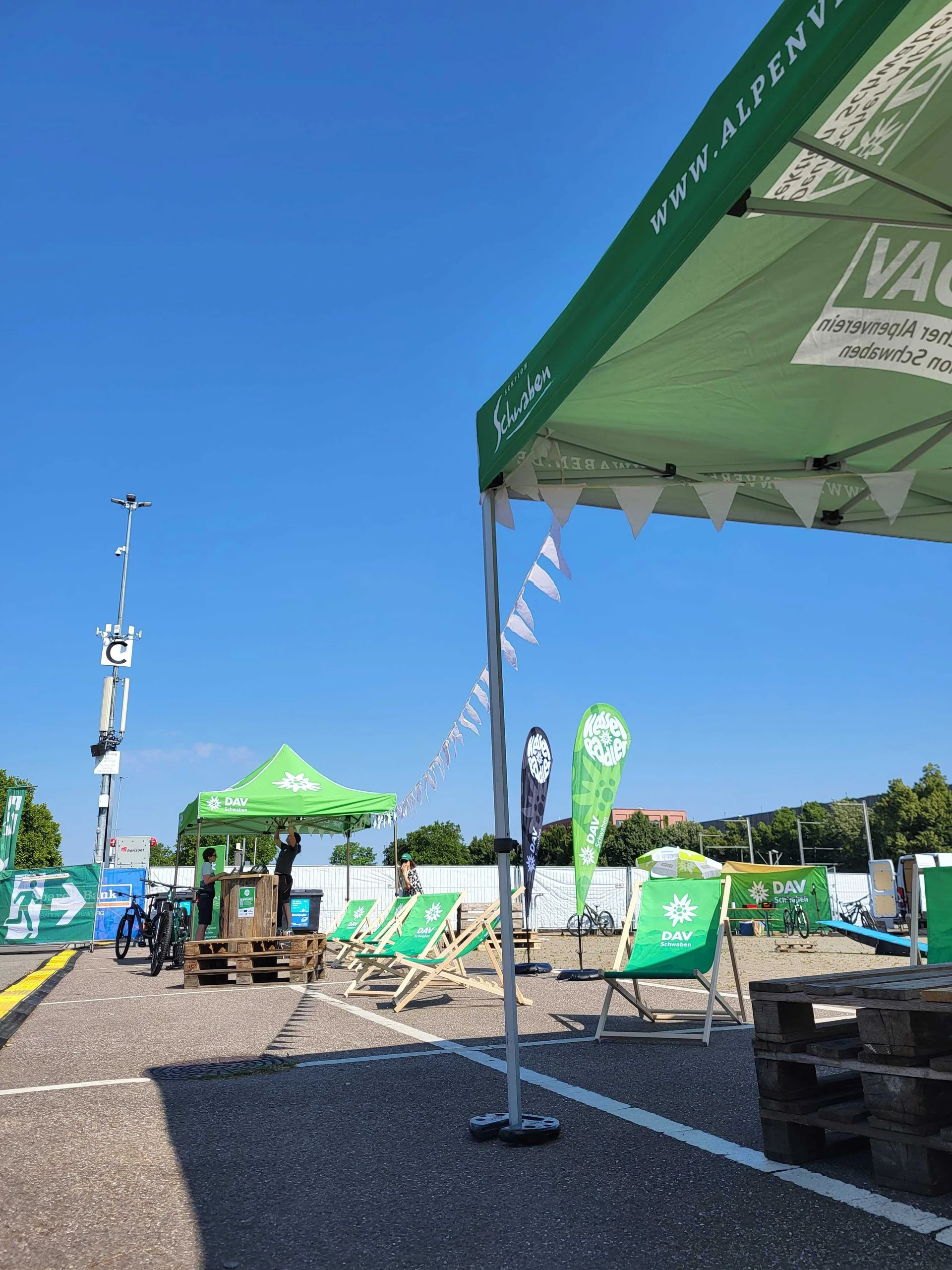 Am Donnerstag vor dem Festival ging es dann los mit dem Aufbau auf dem Festivalgelände im Stuttgarter Neckarpark. Zelte wurden gestellt, Banner aufgehängt, Infomaterial ausgelegt –natürlich durfte auch ein Fahrtechnik-Parcours und eine Ecke mit Liegestühlen zur Entspannung im Schatten nicht fehlen.