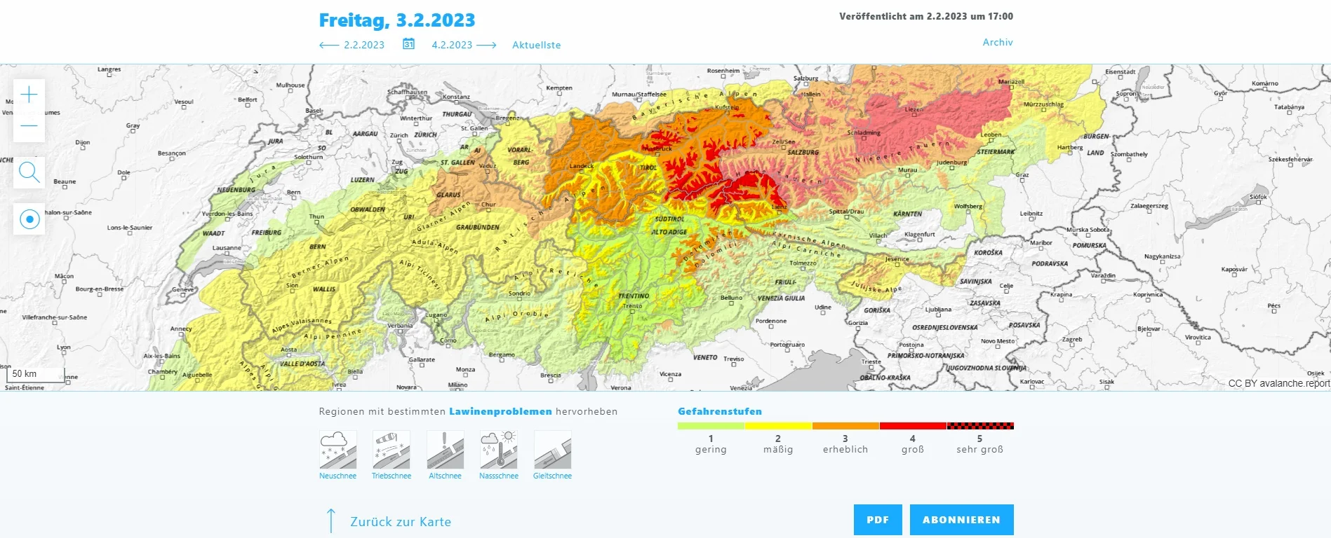 Der Lawinenlagebericht (LLB) ist essenziell bei der Planung winterlicher Bergabenteuer. Hier findet ihr eine Übersichtskarte mit Links zu allen europäischen Vorhersagen.